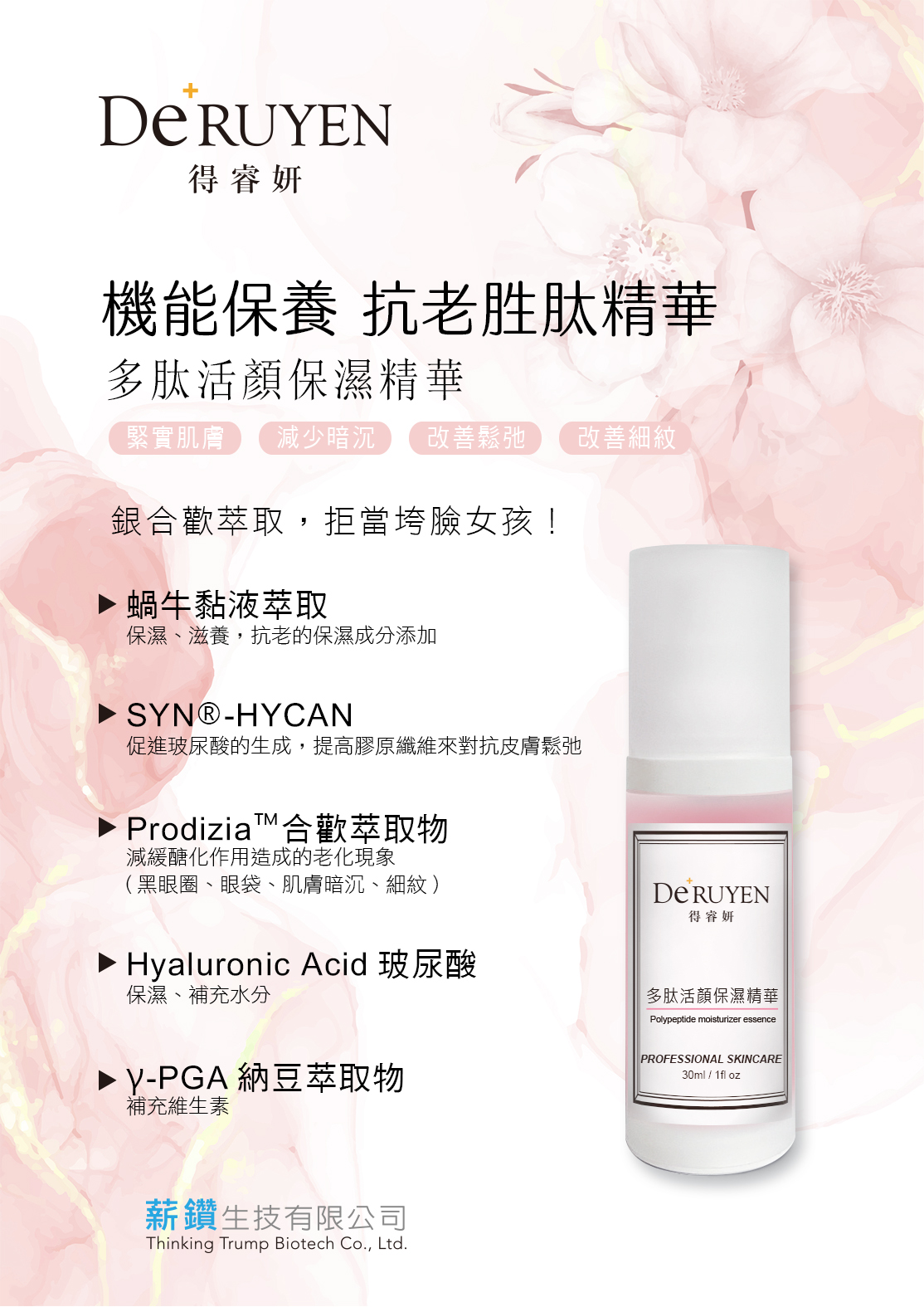 銀合歡萃取可以緊實皮膚及改善表皮細紋,達到延緩老化的目的多肽活顏保濕精華主要成份: